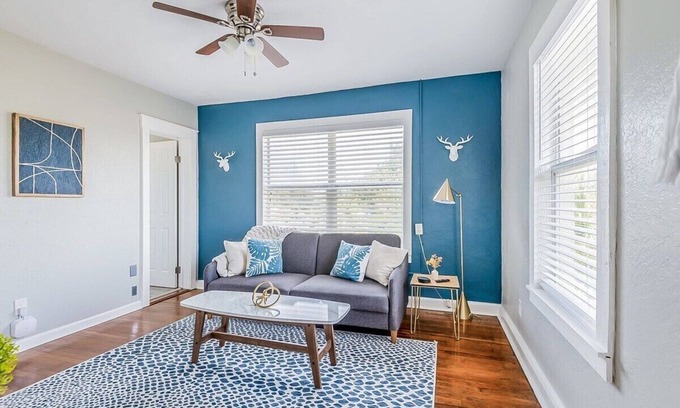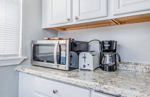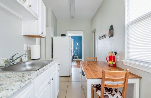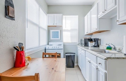 A service fee and the required Brevard County resort/sales taxes are charged on top of the nightly rate. The exterior of the building is monitored by 24-hour surveillance – which we’ve never had to use – but adds an extra level of security. There is a train that runs through downtown Melbourne and can be heard in the late evening and early morning hours. A floor fan is available in the unit if white noise is needed for light sleepers. There are four one-bedroom units in the building; you may occasionally hear other guests. Although only a couple blocks from downtown, the street is residential, so please respect our (11 pm - 8am) quiet hours. Off-street parking for one vehicle/unit behind the house is available. Beware, the archway over the driveway is narrow. A van or SUV is fine but please go very slowly under the archway; you may need to fold in the mirrors. Additional street parking for a second vehicle or larger trucks/vans is available on the other side of the street.