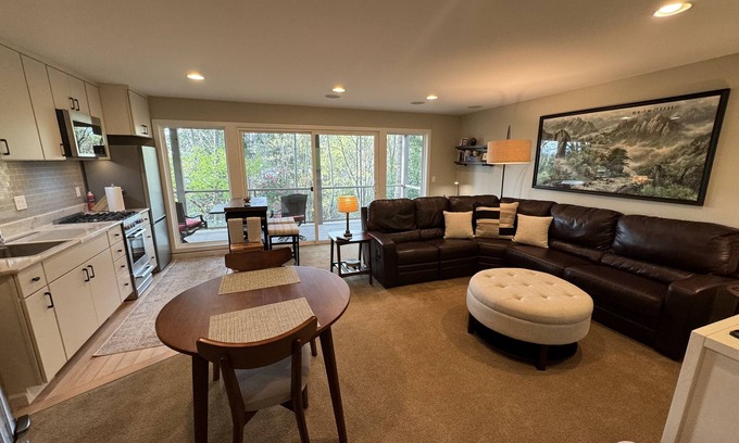After sharing our ground floor apartment for 12 years as Premier Hosts, with over 200 five-star reviews (VRBO #341581, https://www.vrbo.com/341581?unitId=341581), we are ready to welcome you to our second place! This newly completed fully contained apartment in our family home in a quiet residential neighborhood is reached by a separate entrance one floor down from street level. This unit boasts a spacious open concept living/dining/kitchen area with all appliances. You’ll have full refrigerator, gas stove, dishwasher, microwave and a lovely gas fireplace. The kitchen is fully stocked with cooking utensils and dinnerware. You’ll enjoy a comfortable leather sofa with two recliners which provides perfect viewing spot for 75inch smart TV. The table seats 4 guests with multiple other seating areas for your group. The room has a lovely outlook to the wooded garden with a view of the Burke-Gilman trail with outdoor access to the full length deck through sliding doors. On the deck you can enjoy the view or grill on the large handy gas grill. Garden, patio and fire pit use by arrangement.