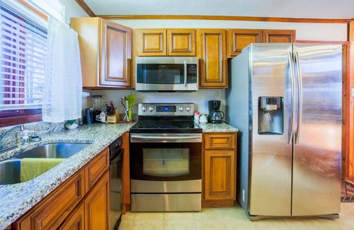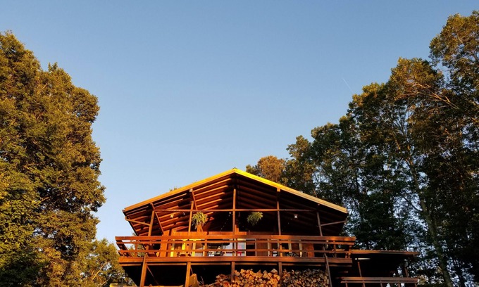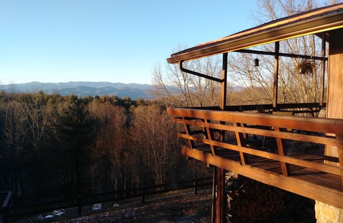 Nestled in the woods of Brevard, North Carolina this charming cabin offers a spectacular view of the Great Smokey Mountains. Walk through the front door and embrace the beauty of this luxurious, open floor plan cabin with an enormous, stone fireplace that runs through the entire house. From the vaulted ceilings to the custom wood floors your mountain vacation keeps getting better. The kitchen features stainless steel appliances, granite countertops and is equipped with everything to prepare a meal. There is a large dining area with plenty of seating and a nice view of the fireplace. The living room is cozy with mountain views from the windows and it is perfectly positioned to keep you warm by the fire. The upstairs is lovely but wait until you see the porch!! As we walk out onto the porch you will first notice the incredible views of the Great Smokey Mountains!! Here, you will find your peace. The porch has plenty of room as well as seating for entertaining. We've provided a stainless steel grill for your bbq needs. Also, you can connect a constellation with our state of the art telescope and keep your eyes on the trees with our set of binoculars, and you're bound to catch a glimpse of the native birds of North Carolina. The main floor also features a queen size bed with an attached bathroom. As we move to the downstairs you will notice the custom stairs that gives you a fancy feel as you drop in to the first king size bedroom. The king size room provides you with amply amount of space to store your belongings. Now, as we shift into the open floor plan of the queen size room you will notice the continuance of the fireplace. It will provide plenty of heat on those chilly winter nights! The shared bathroom has a drop-in tub and a custom tiled shower. The third bedroom downstairs is perfect for all the young at heart with twin bunk beds and chest full of games, puzzles and activities for kids. In the basement is a washer and dryer accessible to our guests. T