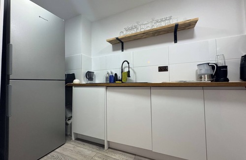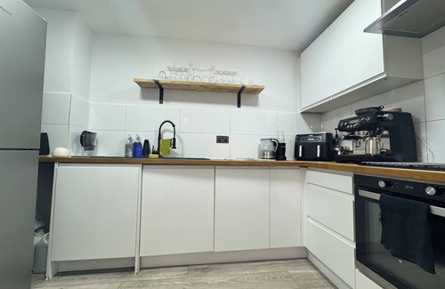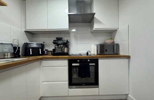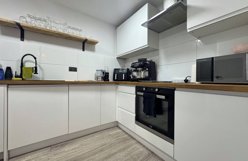 Hop into the fully equipped kitchen that blends style with practicality — ideal for everything from preparing delicious meals to quick breakfasts. With wooden countertops, white modern cabinetry and plenty of appliances, you'll have everything you need throughout your stay. Fitted with items such as a fridge freezer, oven, hob, toaster, kettle and coffee machine, what more could you need? There is also a handy dishwasher and in the hallway opposite a washer and a separate dryer, so you can spend more time exploring the city, and less time doing chores!